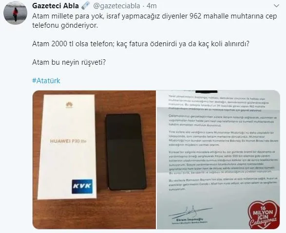 "Bütçem yok" bahanesiyle şehir hastanesinin yollarının yapımını bile ipral eden İBB Başkanı Ekrem İmamoğlu 962 muhtara akıllı telefon hediye etti. Piyasa değeri 2 bin 600 lira olan akıllı telefonların İBB'ye maliyeti tam 2 milyon 500 bin TL oldu. Vatandaşlar, pandemi sürecinde hastane yolu gibi önemli bir projeyi "bütçem yok" diyerek yapmayan İmamoğlu'nun, muhtarlara akıllı telefon hediye etmesini tepkiyle karşıladı. Sosyal medyada, "Askıda fatura uygulamasıyla sözde dar gelirlilere yardım toplayan İmamoğlu, bu kadar akıllı telefon parasıyla kaç dar gelirlinin faturası ödenirdi?" yorumları yapıldı.