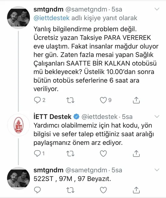 Sosyal paylaşım sitesi Twitter'da "@sametgndm" mahlasını kullanan sağlık çalışanın paylaşımları ve İETT Hizmet hesabıyla yaptığı yazışmalar, İstanbul Büyükşehir Belediyesi'nin ulaşımda sınıfta kaldığını gözler önüne seriyor.