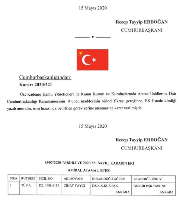 Başkan Recep Tayyip Erdoğan imzasıyla yayımlanan karara göre, Deniz Kuvvetleri Komutanlığı Kurmay Başkanı Tümamiral Yaycı, Genelkurmay Başkanlığı emrine atandı.
