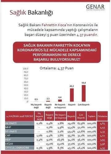 Türkiye kamuoyu hükümeti ve Sağlık Bakanlığını çok başarılı buluyor. Türkiye'nin yüzde 70'i Sağlık Bakanlığı'nın toplum ile paylaştığı verilerin güvenli olduğuna inanıyor. Yüzde 75'e Sağlık Bakanlığı'nı başarılı bulmaktadır. CHP seçmeninin yüzde 63'ü Sağlık Bakanı Fahrettin Koca'yı başarılı bulmaktadır.