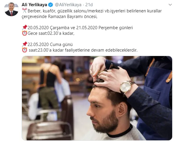 Yerlikaya'nın çalışma saatleriyle ilgili paylaşımında, "Berber, kuaför, güzellik salonu/merkezi vb. işyerleri belirlenen kurallar çerçevesinde Ramazan Bayramı öncesi, 20.05.2020 Çarşamba ve 21.05.2020 Perşembe günleri Gece saat:02.30'a kadar, 22.05.2020 Cuma günü saat 23.00'a kadar faaliyetlerine devam edebileceklerdir." ifadeleri yer aldı.