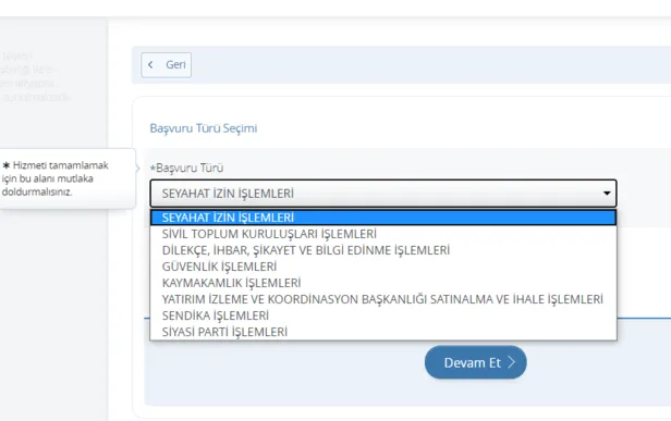 - Başvuru türü kısmında "Seyahat İzin İşlemleri" işaretleyin.