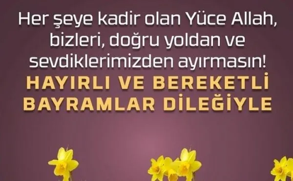 Hep bir arada, sevgi dolu ve huzurlu nice bayramlar geçirmek dileğiyle, Ramazan Bayramınız kutlu olsun! Mübarek Ramazan Bayramı tüm ulusumuza kutlu olsun. Allah tüm inananlara nice huzurlu, bereketli bayramlar nasip etsin.