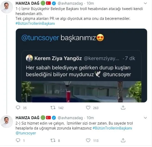 CHP'li İzmir Büyükşehir Belediye Başkanı Tunç Soyer'in PR çalışması hüsranla sonuçlandı. Önce ekibinde görevli Kerem Ziya Yangöz'e "Her sabah belediyeye gelirken durup kuşları beslediğini biliyor muydunuz @tuncsoyer" diye paylaşım yaptıran Soyer, daha sonra troll hesabından "Sadece insanların değil İzmir'deki bütün canlıların başkanı Tunç Soyer başkanımız" şeklinde yorumda bulunarak kendi kendinin reklamını yapmaya çalışıyordu.