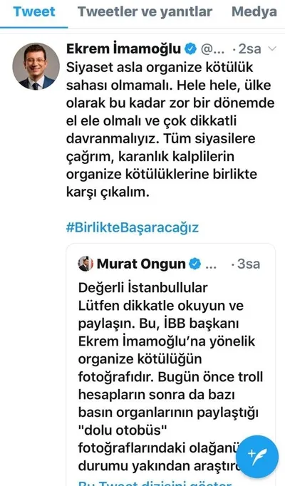İBB Başkanı Ekrem İmamoğlu da; Twitter hesabından Murat Ongun'un 7 paylaşımını etiketledi ve ''Siyaset asla organize kötülük sahası olmamalı. Hele hele, ülke olarak bu kadar zor bir dönemde el ele olmalı ve çok dikkatli davranmalıyız. Tüm siyasilere çağrım, karanlık kalplilerin organize kötülüklerine birlikte karşı çıkalım'' iddiasında bulundu.