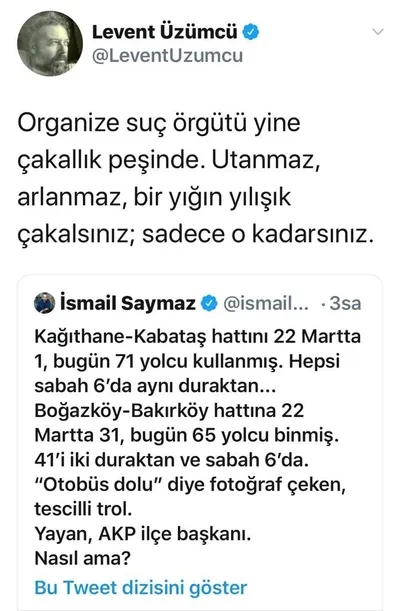 CHP Eski Ankara Milletvekili Aylin Nazlıaka: "Sırf Ekrem İmamoğluna çamur atmak için #koronavirüs salgınının olduğu bir dönemde 40-50 kişilik guruplar halinde otobüse binmek hangi aklın ürünüdür? Halk can derdindeyken, bunlar kötülük peşinde. Üstelik kendi canlarını da tehlikeye atmışlar. Bu kafayla başetmek virüsten zor!"