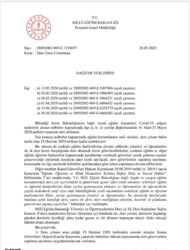 Milli Eğitim Bakanlığı'nca 81 il Valiliği'ne gönderilen resmi yazı ile öğretmenlerin 19 Haziran'a kadar idari izinli sayılacakları bildirildi. İdari izin süresi resmi yazı ile birlikte uzatılmış oldu.