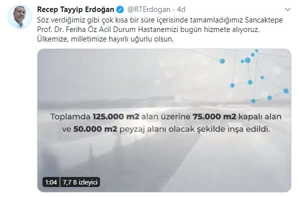 Erdoğan, "Söz verdiğimiz gibi çok kısa bir süre içerisinde tamamladığımız Sancaktepe Prof. Dr. Feriha Öz Acil Durum Hastanemizi bugün hizmete alıyoruz. Ülkemize, milletimize hayırlı uğurlu olsun." ifadelerini kullandı.