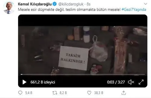 Kılıçdaroğlu'nun Nazım Hikmet'in dizeleriyle seslendiği videoyu, Zülfü Livaneli'nin şarkıları eşliğinde, "Mesele esir düşmekte değil, teslim olmamakta bütün mesele! #Gezi7Yaşında" notuyla paylaştı.