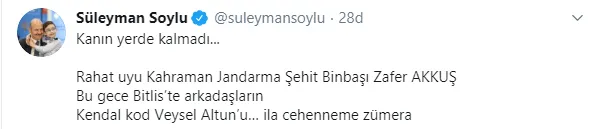 Soylu Twitter hesabından yaptığı açıklamada, "Kanın yerde kalmadı... Rahat uyu Kahraman Jandarma Şehit Binbaşı Zafer AKKUŞ Bu gece Bitlis'te arkadaşların Kendal kod Veysel Altun'u… ila cehenneme zümera" dedi.