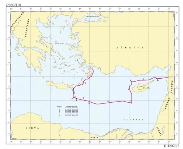 Dışişleri Bakanlığı, Türkiye'nin, Birleşmiş Milletler'e (BM) bildirdiği Doğu Akdeniz'deki deniz sınırları içinde, Türkiye Petrolleri Anonim Ortaklığının (TPAO) sismik araştırma ve sondaj ruhsat başvurusunda bulunduğu yeni ruhsat sahalarını gösteren haritayı paylaştı.
