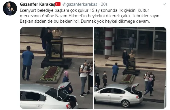 Esenyurt AK Parti Meclis Üyesi Gazanfer Karakaş, CHP'li Esenyurt Belediyesinin projesini tiye alarak böyle paylaştı. "Esenyurt belediye başkanı çok şükür 15 ay sonunda ilk çivisini Kültür merkezinin önüne Nazım Hikmet'in heykelini dikerek çaktı. Tebrikler sayın Başkan sizden de bu beklenirdi, Durmak yok heykel dikmeğe devam."