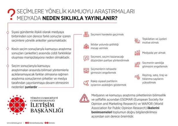 Cumhurbaşkanlığı İletişim Başkanı Fahrettin Altun, sosyal medya hesabından "Seçimlere yönelik kamuoyu araştırmaları medyada neden sıklıkla yayınlanır?", "Seçimlere yönelik kamuoyu araştırmaları güvenilir mi?" başlığıyla iki paylaşımda bulundu.