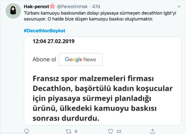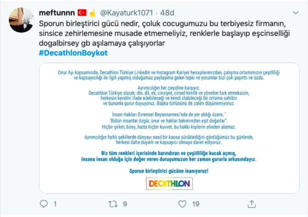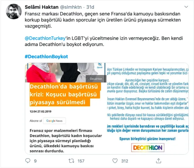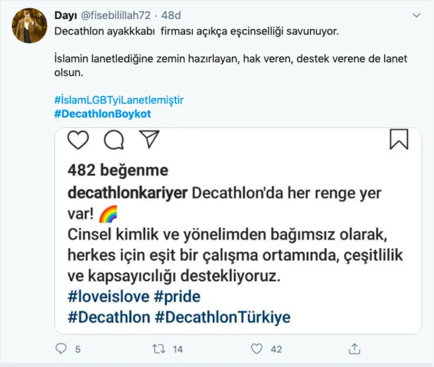Decathlon'un sporcu başörtüsü konusunda takındığı tutum ortadayken 'her tür ayrımcılığa karşıyız' tezi üzerinden LGBTİ'ye arka çıkmayı sürdürmesi üzerine sosyal medyada #DecathlonBoykot etiketi altında boykot kampanyası başlattı.