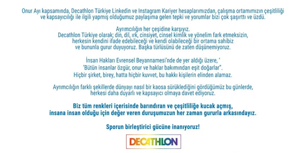 "Onur Ayı kapsamında, Decathlon Türkiye Linkedin ve Instagram Kariyer hesaplarımızdan, çalışma ortamımızın çeşitliliği ve kapsayıcılığı ile ilgili yapmış olduğumuz paylaşıma gelen tepki ve yorumlar bizi çok şaşırttı ve üzdü.