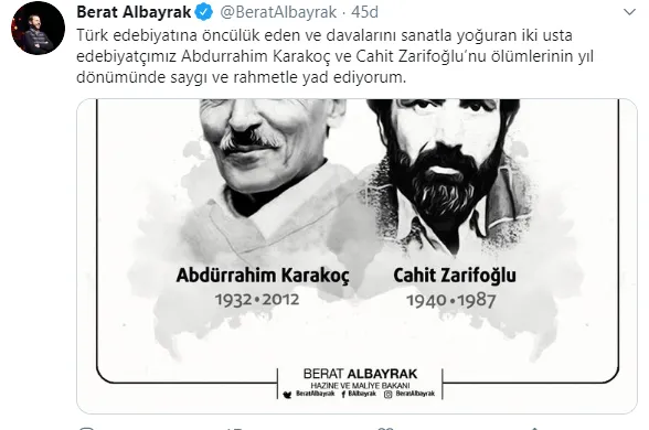 Hazine ve Maliye Bakanı Berat Albayrak, Türk edebiyatının önemli şair ve yazarlarından Abdurrahim Karakoç ve Cahit Zarifoğlu'nun vefat yıl dönümleri dolayısıyla yayınladığı mesajında "Türk edebiyatına öncülük eden ve davalarını sanatla yoğuran iki usta edebiyatçımız Abdurrahim Karakoç ve Cahit Zarifoğlu'nu ölümlerinin yıl dönümünde saygı ve rahmetle yad ediyorum" ifadesini kullandı.
