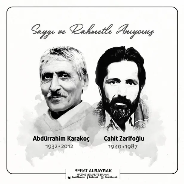 Hazine ve Maliye Bakanı Berat Albayrak, şair Abdurrahim Karakoç ve Cahit Zarifoğlu'nu ölümlerinin yıl dönümünde andı.