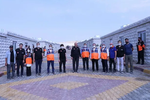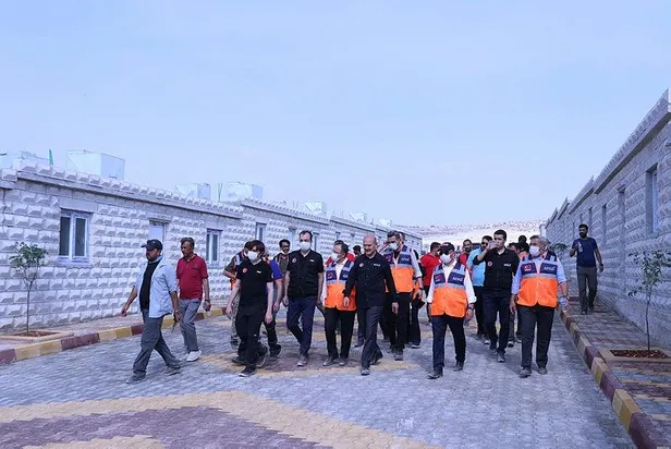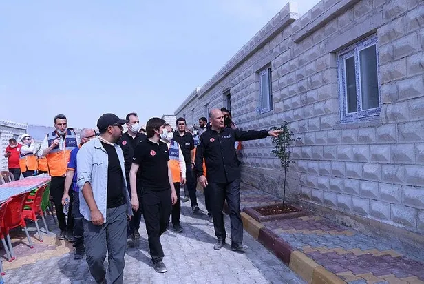 AFAD öncülüğünde, Esed rejimi ve destekçilerinin saldırılarından kaçan siviller için burada yapılan briket evleri inceleyen Soylu, insani yardım çalışmaları hakkında bilgi aldı.