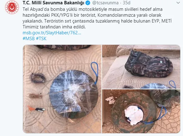 Bakanlığın Twitter hesabından yapılan açıklamada, "Tel Abyad'da bomba yüklü motosikletiyle masum sivilleri hedef alma hazırlığındaki PKK/YPG'li bir terörist, komandolarımızca yaralı olarak yakalandı. Teröristin sırt çantasında tuzaklanmış halde bulunan El Yapımı Patlayıcı (EYP), Mayın ve El Yapımı Patlayıcı Tespit İmha Timimiz (METİ) tarafından imha edildi" denildi.
