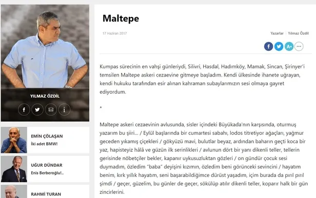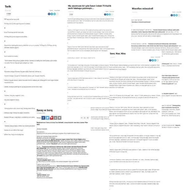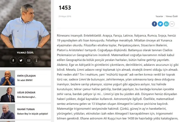 9: (Sözcü – "Tarih" – 22 Mayıs 2020) = (Sözcü – "Hiç unutmam bir gün İsmet İnönü 75 kişilik sınıfı falakaya yatırmıştı…" – 10 Haziran 2018) = (Sözcü – "Sevr, Nur, Hira" – 13 Nisan 2017) = (Sözcü – "Macellan müezzindi" – 18 Kasım 2014) = (Hürriyet – "Savaş ve barış" – 19 Şubat 2013)