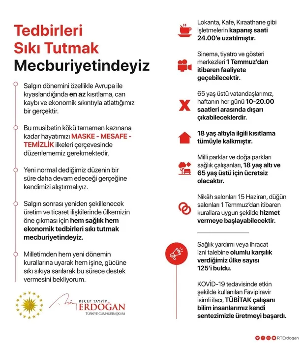 "Lokanta, kafe, kıraathane gibi işletmelerin kapanış saati 22.00'den 00.00'a uzatılmıştır. Sinema, tiyatro, gösteri merkezi gibi işletmeler 1 Temmuz'dan itibaren belirlenen kurallara göre faaliyete geçebilecektir. 65 yaş üstü vatandaşlarımız haftanın her günü 10.00 ila 20.00 saatleri arasında dışarı çıkabilecektir. 18 yaş altı ile ilgili kısıtlama ise küçüklerin ebeveynleri refakatinde olmaları şartıyla tümüyle kalkmıştır. Milli parklar ve doğa parkları sağlık çalışanları, 18 yaş altı ve 65 yaş üstü için ücretsiz olacaktır. Nikah salonları 15 Haziran'dan itibaren, düğün salonları ise 1 Temmuz'dan itibaren belirlenen kurallara uygun şekilde hizmet vermeye başlayabilecektir. Aldığımız kararların ülkemize, milletimize hayırlı olmasını Allah'tan diliyorum."