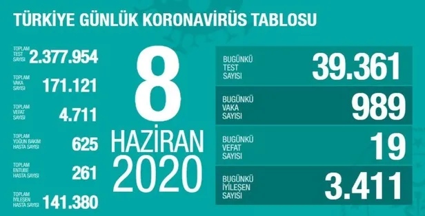 SAĞLIK Bakanlığı, dün 19 hastanın vefat ettiğini, toplam can kaybının 4 bin 711'e yükseldiğini, 989 yeni vakayla birlikte toplam vaka sayısının 171 bin 121'e ulaştığını açıkladı. Dün 3 bin 411 iyileşen ile birlikte toplam iyileşen sayısı 140 bin 380'e yükseldi.