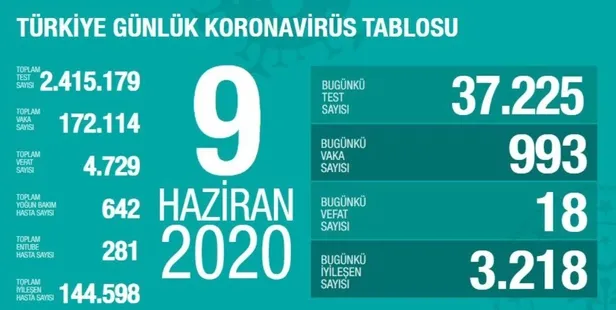 Son dakika haberine göre, Sağlık Bakanı Fahrettin Koca Twitter üzerinden 9 Haziran yeni tip koronavirüs (Kovid-19) vaka, iyileşen ve vefat sayılarını içeren tabloyu paylaştı. Son 24 saatte 18 hasta vefat ederken, 3 bin 218 hasta ise iyileşti.