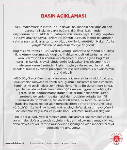 Adalet Bakanı Abdulhamit Gül, ABD'nin İstanbul Başkonsolosluğu eski çalışanı Metin Topuz'a "FETÖ'ye yardım suçundan" 8 yıl 9 ay hapis cezası verilmesini eleştiren ABD makamlarına tepki göstererek, bağımsız ve tarafsız Türk yargısının, emir alacağı tek mercinin Anayasa ve kanunlar olduğunu belirtti.