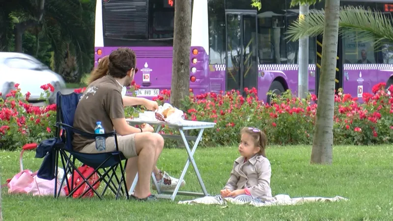 Sahildeki vatandaşların kimi yürüyüş yaptı, kimi yeşillik alanda masa kurup kahvaltısını etti.