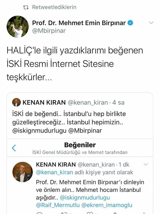 İstanbul Büyükşehir Belediyesi’ne bağlı İstanbul Su ve Kanalizasyon İdaresi’nin (İSKİ) resmi Twitter hesabı Çevre ve Şehircilik Bakan Yardımcısı Prof. Dr. Mehmet Emin Birpınar’ın Haliç konusundaki uyarılarına beğenide bulundu. Prof. Dr. Mehmet Emin Birpınar; “Haliç’le ilgili yazdıklarımı beğenen İSKİ resmi internet sitesine teşekkürler...” ifadelerini kullandı.