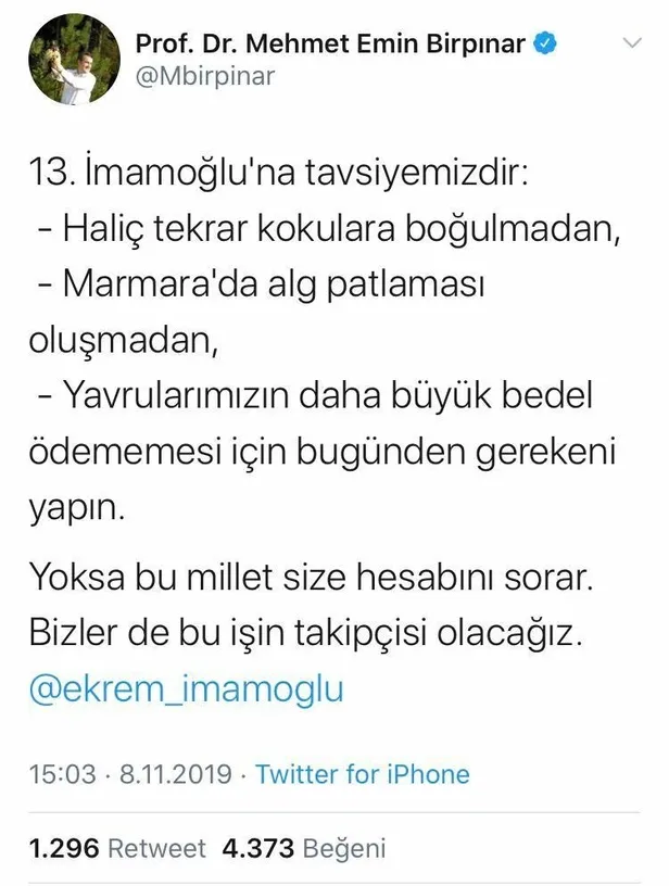 Sosyal paylaşım sitesi Twitter'da bir kullanıcı; Çevre ve Şehircilik Bakan Yardımcısı Prof. Dr. Mehmet Emin Birpınar'ın 8 Kasım 2019 tarihli paylaşımını hatırlattı.