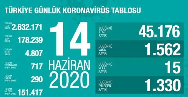 Sağlık Bakanlığının internet sitesinde yer alan ve Sağlık Bakanı Fahrettin Koca'nın da Twitter'dan paylaştığı "Türkiye Günlük Koronavirüs Tablosu"nun güncel verilerine göre, bugün 45 bin 176 test yapıldı, 1562 kişiye Kovid-19 tanısı konuldu. Son 24 saatte 15 hasta vefat ederken 1330 kişi iyileşti.