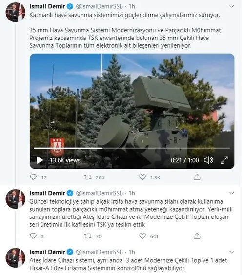 "Katmanlı hava savunma sistemimizi güçlendirme çalışmalarımız sürüyor. 35 mm Hava Savunma Sistemi Modernizasyonu ve Parçacıklı Mühimmat Projemiz kapsamında TSK envanterinde bulunan 35 mm Çekili Hava Savunma Toplarının tüm elektronik alt bileşenleri yenileniyor.