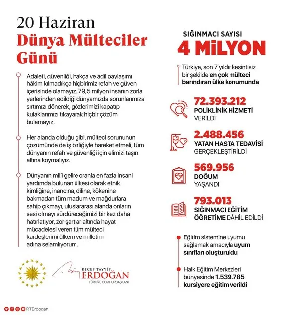 Başkan Erdoğan 20 Haziran Dünya Mülteciler Günü dolayısıyla Twitter adresinden yaptığı paylaşımda, "Türkiye olarak inancına, diline, kökenine bakmadan tüm mazlum ve mağdurlara sahip çıkmayı, onların uluslararası alandaki sesi olmayı sürdüreceğiz." ifadelerini kullandı.