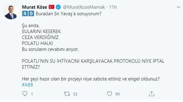 40: Buradan Sn Yavaş'a soruyorum? Şu anda, SULARINI KESEREK CEZA VERDİĞİNİZ POLATLI HALKI Bu soruların cevabını arıyor. POLATLI'NIN SU İHTİYACINI KARŞILAYACAK PROTOKOLÜ NİYE İPTAL ETTİNİZ? Her şeyi hazır olan bir projeyi niye sabote ettiniz ve engel oldunuz?