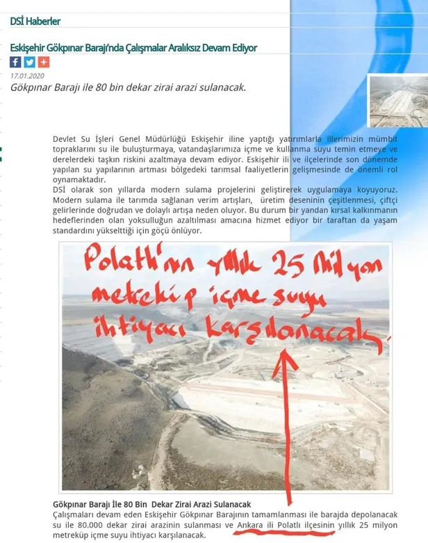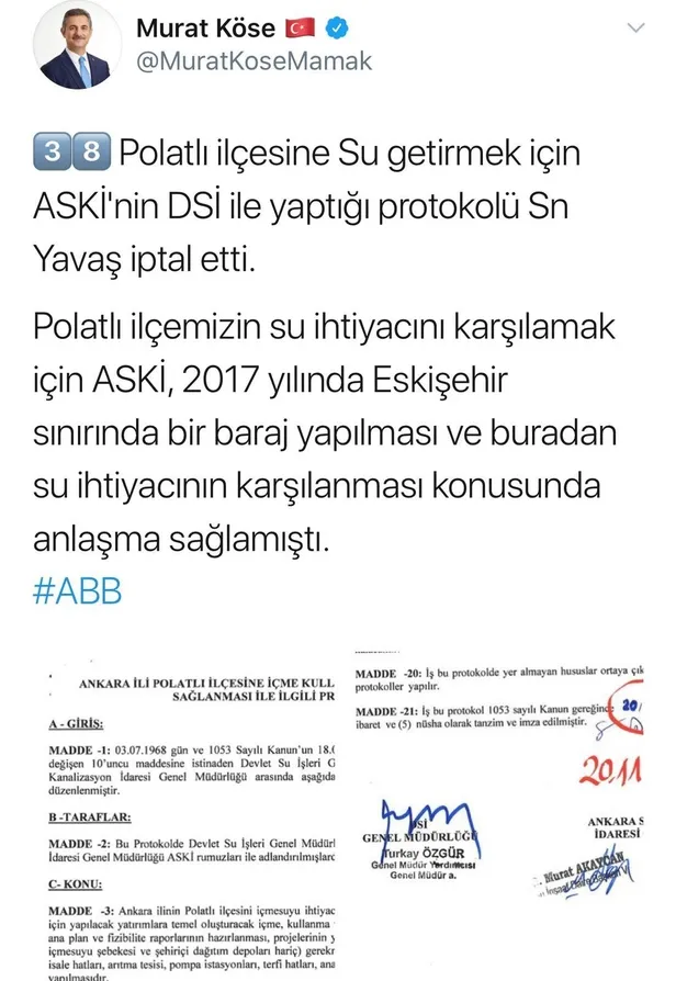 38: Polatlı ilçesine Su getirmek için ASKİ'nin DSİ ile yaptığı protokolü Sn Yavaş iptal etti. Polatlı ilçemizin su ihtiyacını karşılamak için ASKİ, 2017 yılında Eskişehir sınırında bir baraj yapılması ve buradan su ihtiyacının karşılanması konusunda anlaşma sağlamıştı. #ABB