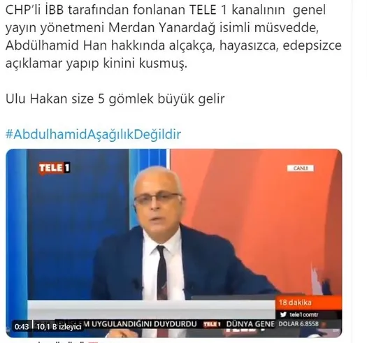 CHP'li İBB tarafından fonlanan TELE 1'in Genel Yayın Yönetmeni Merdan Yanardağ, canlı yayında haddini aştı ve Osmanlı Devleti Padişahı Sultan Abdülhamid Han'a hakaret etti. Skandal sözlerinin ardından vatandaşlar Merdan Yanardağ'a büyük tepki gösterdi ve RTÜK konuyla ilgili inceleme başlattı.