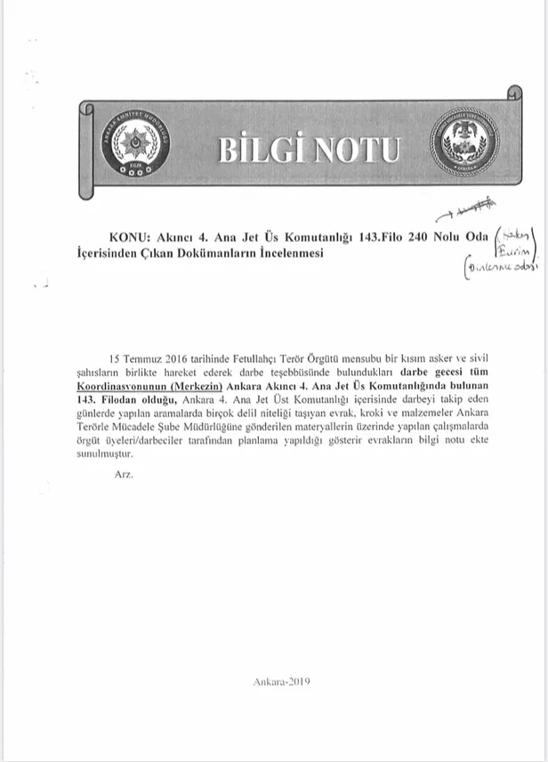 Ankara Cumhuriyet Başsavcılığı ve Ankara Emniyet Müdürlüğü; 15 Temmuz 2016 tarihinde Fetullahçı Terör Örgütü mensubu bir kısım asker ve sivil şahısların birlikte hareket ederek darbe teşebbüsünde bulundukları darbe gecesi tüm koordinasyon merkezinin Ankara 4. Ana Jet Üs Komutanlığı 143. Filo'dan olduğu tespit etti.