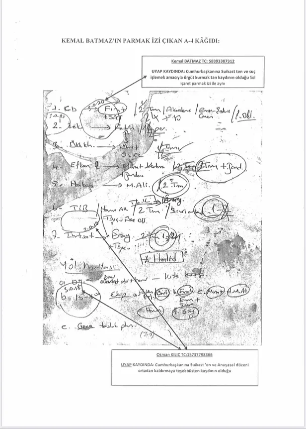 Söz konusu notlarda; dönemin Genelkurmay Başkanlığı Özel Kalem Müdürü, sözde "yurtta sulh konseyi" üyesi eski kurmay albay Osman Kılıç'ın da parmak izi tespit edildi. Osman Kılıç da, Cumhurbaşkanı Erdoğan'a suikast ve suç işlemek amacıyla örgüt kurmaktan yargılanıyor.