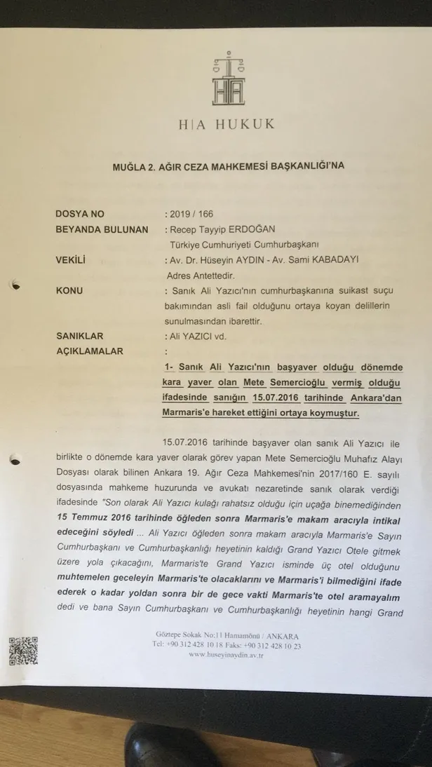 Cumhurbaşkanı Erdoğan'ın avukatı Hüseyin Aydın, sanık Ali Yazıcı'nın Cumhurbaşkanı'na suikast suçu bakımından asıl fail olduğunu ortaya koyan delilleri Muğla 2. Ağır Ceza Mahkemesi'ne sundu.