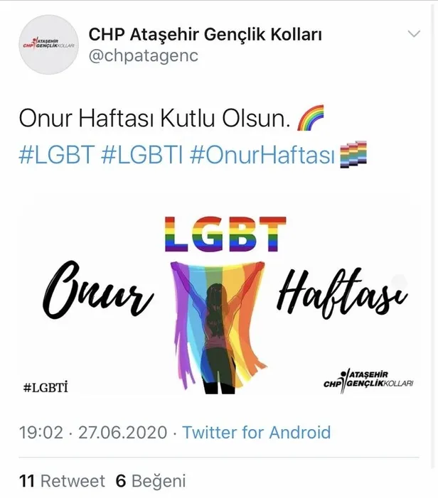 CHP’li siyasetçiler ve gençlik kolları da; "lezbiyen", "gey", "biseksüel"lerle ilgili çalışmalar yapan eş cinsel sapkınlık projesi LGBT Hareketi’ne destek veren paylaşımda bulundu.