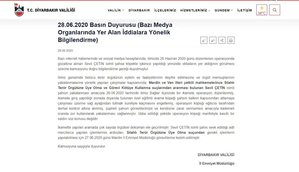 Diyarbakır Valiliğinden yapılan açıklamada, bazı internet haberlerinde ve sosyal medya hesaplarında kentte 26 Haziran'da düzenlenen operasyonda gözaltına alınan Sevil Çetin'e köpekle işkence yapıldığı iddiaları üzerine kamuoyunu doğru bilgilendirme gereğinin duyulduğu belirtildi. Açıklamada, "İlimiz genelinde bölücü terör örgütünün eylem ve faaliyetlerinin deşifre edilmesine ve örgüt mensuplarının yakalanmalarına yönelik yapılan çalışmalar kapsamında Mardin ve Van illeri yetkili mahkemelerince silahlı terör örgütüne üye olma ve görevi kötüye kullanma suçlarından aranması bulunan Sevil Çetin isimli şahsın yakalanması amacıyla 26 Haziran'da Bağlar ilçesinde bir ikamete operasyon düzenlenmiştir.