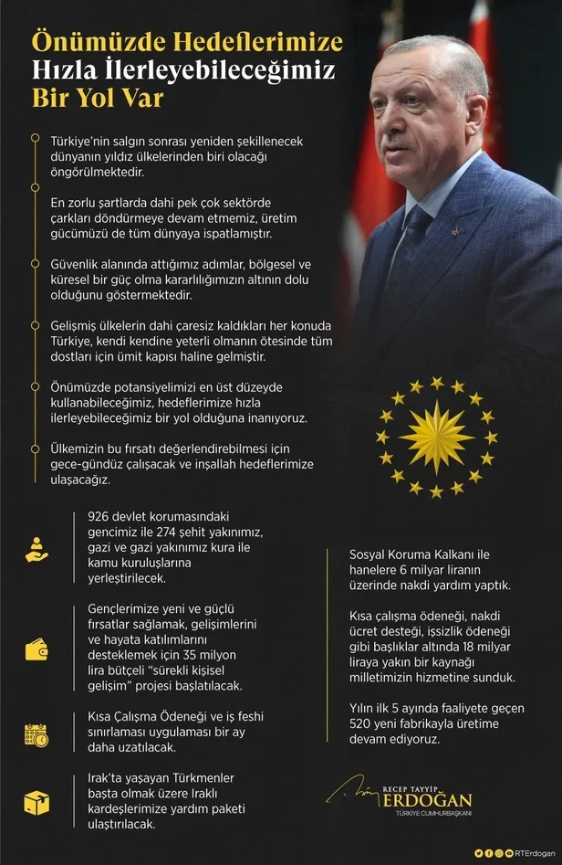 "Gelişmiş ülkelerin dahi çaresiz kaldıkları her konuda Türkiye, kendi kendine yeterli olmanın ötesinde tüm dostları için ümit kapısı haline geldi. Salgın döneminde hizmete aldığımız hastaneler, barajlar, sulama tesisleri, millet bahçeleri, ulaşım yatırımları gibi eserler, 'durmak yok yola devam' sözümüzü ete kemiğe büründürdü. Bu yılın ilk 5 ayında Organize Sanayi Bölgelerimizde 520 yeni fabrikanın faaliyete geçmesi dahi başlı başına bir iftihar vesilesidir. Özel sektörün talep ettiği 110 bin yeni istihdamı öngören 67 milyar liralık Yatırım Teşvik Belgesi de bir diğer önemli göstergedir. Özellikle önümüzde potansiyelimizi en üst düzeyde kullanabileceğimiz, hedeflere hızla ilerleyebileceğimiz bir yol olduğuna inanıyoruz. Ülkemizin bu fırsatı değerlendirebilmesi için gece gündüz çalışacak ve hedeflere ulaşacağız."