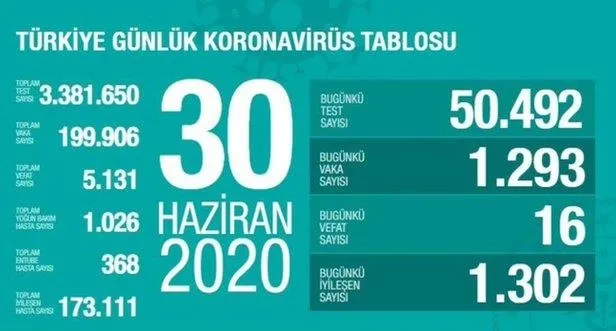 Sağlık Bakanı Fahrettin Koca, dün 1293 kişiye Covid-19 tanısı konulduğunu, 16 kişi hayatını kaybettiğini, toplam vaka sayısının 199 bin 906, can kaybının ise 5 bin 131 olduğunu bildirdi. Koca, "Vaka sayılarını azaltmada yeterince kararlı, tedbirlerde dikkatli değiliz" dedi.