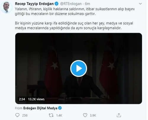Son dakika haberine göre, Başkan Recep Tayyip Erdoğan, kızı Esra Albayrak ve damadı Hazine ve Maliye Bakanı Berat Albayrak'a yapılan ahlaksız saldırılara karşı sosyal medya hesabı üzerinden destek paylaşımında bulundu. Başkan Erdoğan paylaştığı mesajda, "Hukuk önünde her birinden işledikleri suçun hesabını elbette soracağız." ifadelerine yer verdi.