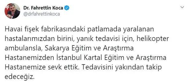 Öte yandan Sağlık Bakanı Koca, Twitter'dan yaptığı açıklamada, "Havai fişek fabrikasındaki patlamada yaralanan hastalarımızdan birini, yanık tedavisi için, helikopter ambulansla, Sakarya Eğitim ve Araştırma Hastanemizden İstanbul Kartal Eğitim ve Araştırma Hastanemize sevk ettik. Tedavisini yakından takip edeceğiz." ifadelerini kullandı.