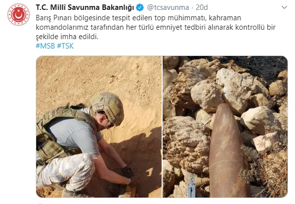 Milli Savunma Bakanlığından (MSB) yapılan açıklamada, "Barış Pınarı bölgesinde tespit edilen top mühimmatı, kahraman komandolarımız tarafından her türlü emniyet tedbiri alınarak kontrollü bir şekilde imha edildi." ifadesine yer verildi.