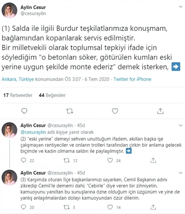 Burdur’da yaptığı skandal açıklamalarla tüm tepkileri üzerine çeken İYİ Parti Isparta Milletvekili Aylin Cesur, o sözlerle ilgili açıklama yaptı. Salda Gölü'nde yapılan çalışmaları eleştirmek için "Salda'nın kumunu tek tek alır, onların uygun yerlerine monte ederiz" diyen Aylin Cesur, o ifadelerin sehven kullandığını söyledi. Skandal ifadelerle ilgili açıklama yapan Çevre ve Şehircilik Bakanı Murat Kurum, “Vekile tavsiyemiz edebini koruması ve çocuklarımıza örnek bir davranış sergilemesidir” ifadelerini kullandı.