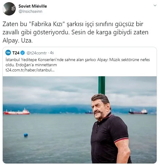Sosyal paylaşım sitesi Twitter'da Alpay şu sözlerle linç edildi: