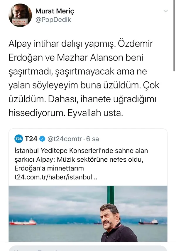 Murat Meriç: "Alpay intihar dalışı yapmış. Özdemir Erdoğan ve Mazhar Alanson beni şaşırtmadı, şaşırtmayacak ama ne yalan söyleyeyim buna üzüldüm. Çok üzüldüm. Dahası, ihanete uğradığımı hissediyorum. Eyvallah usta."